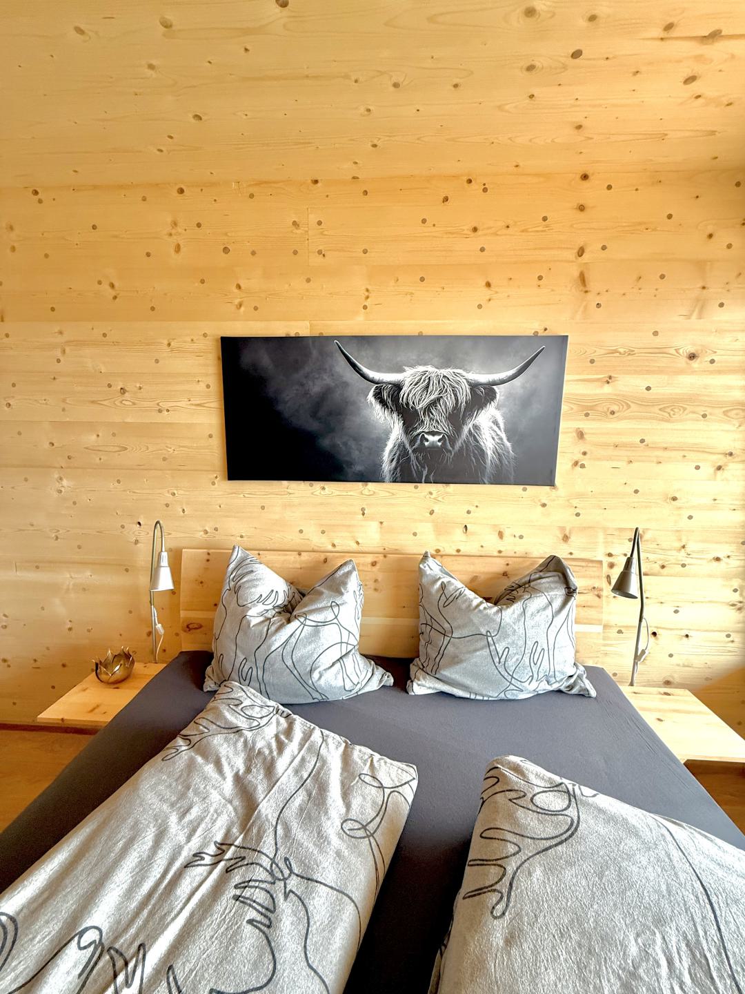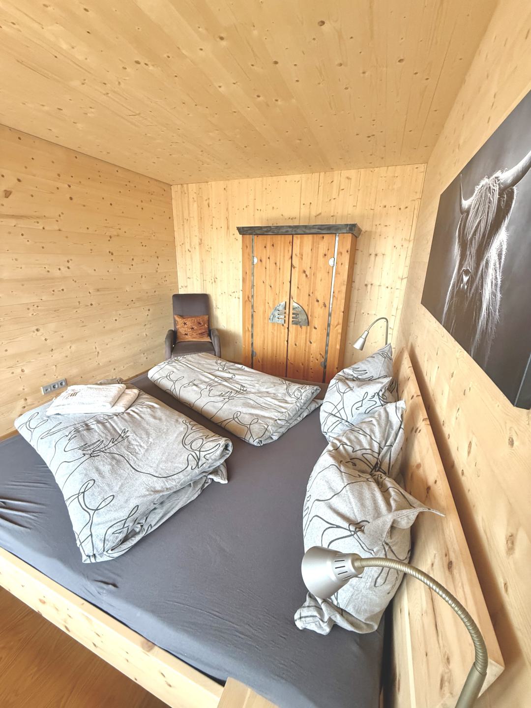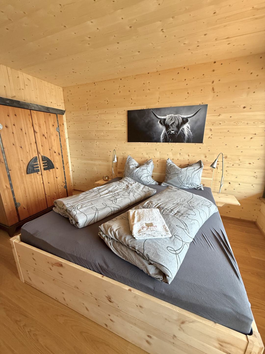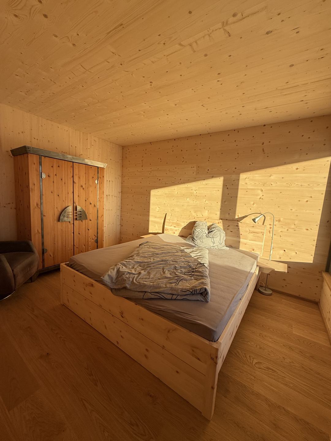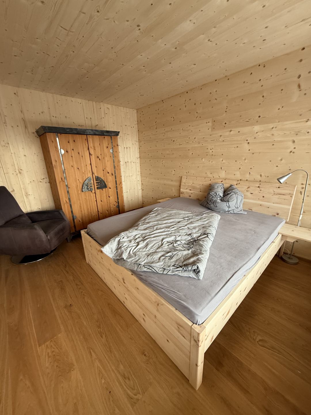 Unsere Wohnung ist absolut barrierefrei und verfügt über ein Schlafzimmer mit einem Zirben-Doppelbett.