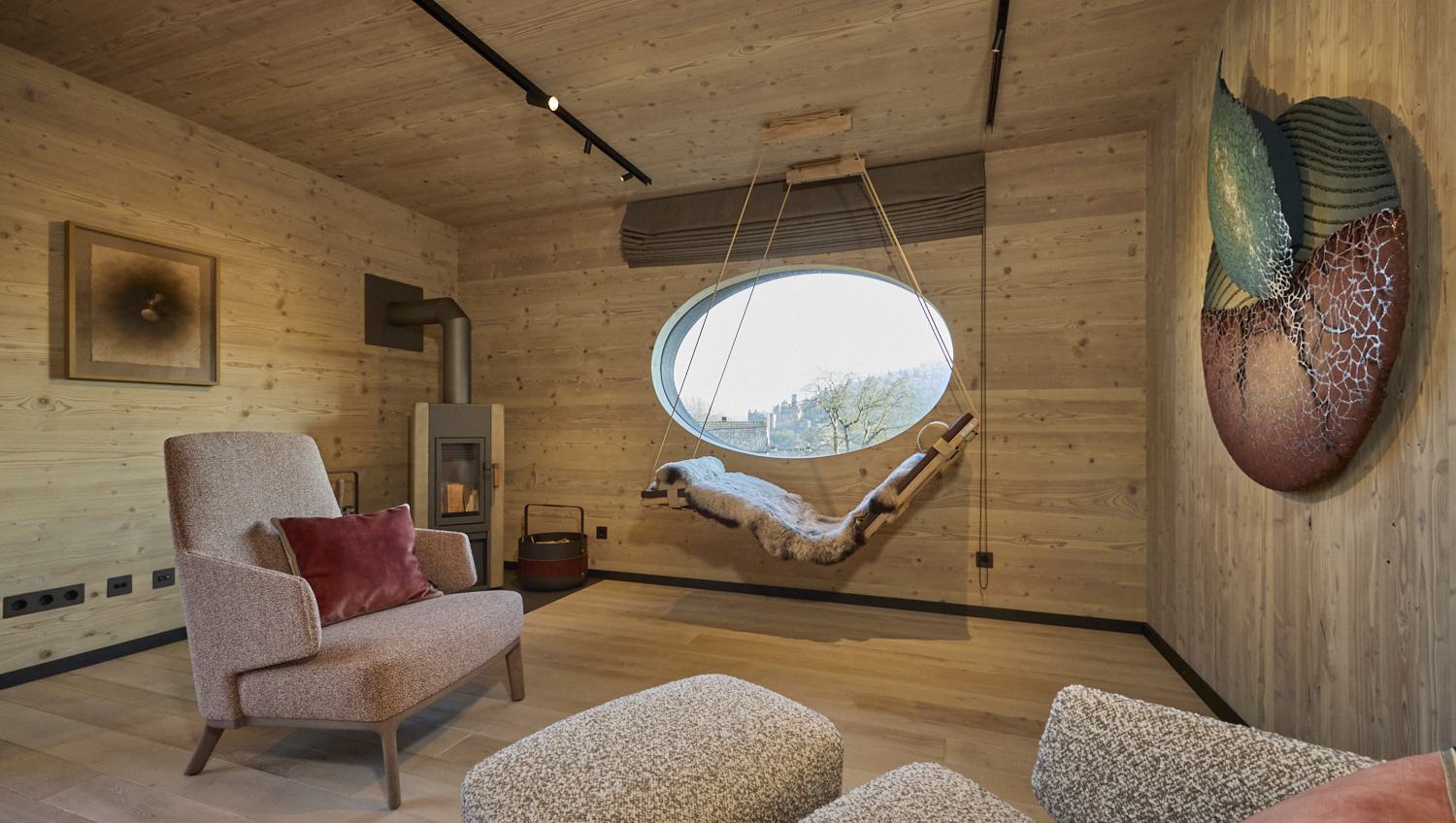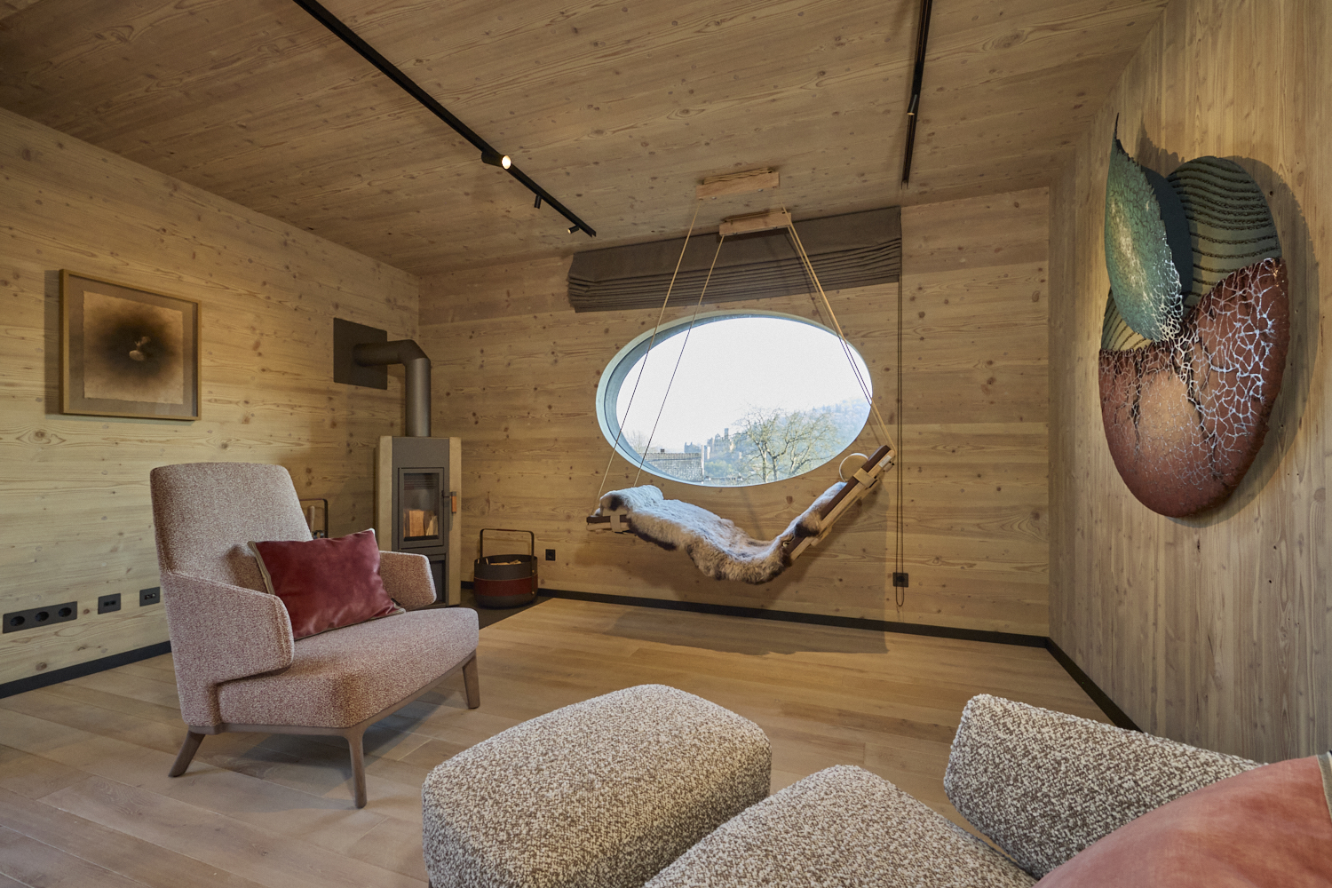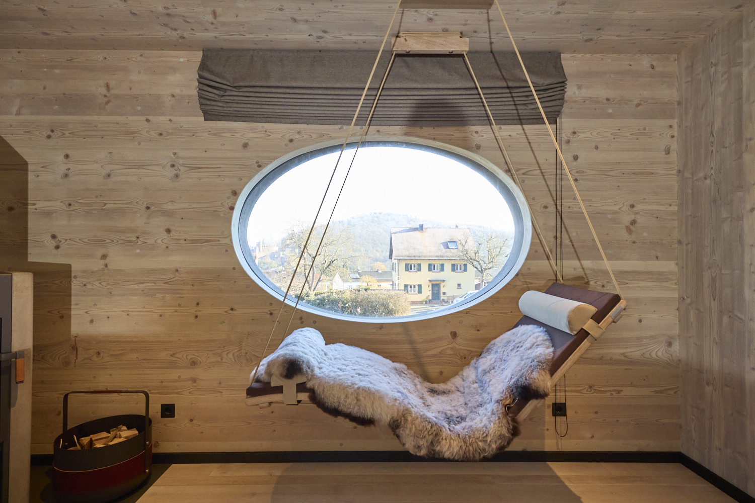 - Übergehend in einen Bereich zum Entspannen mit Hängeliege und Speicher-Holzofen